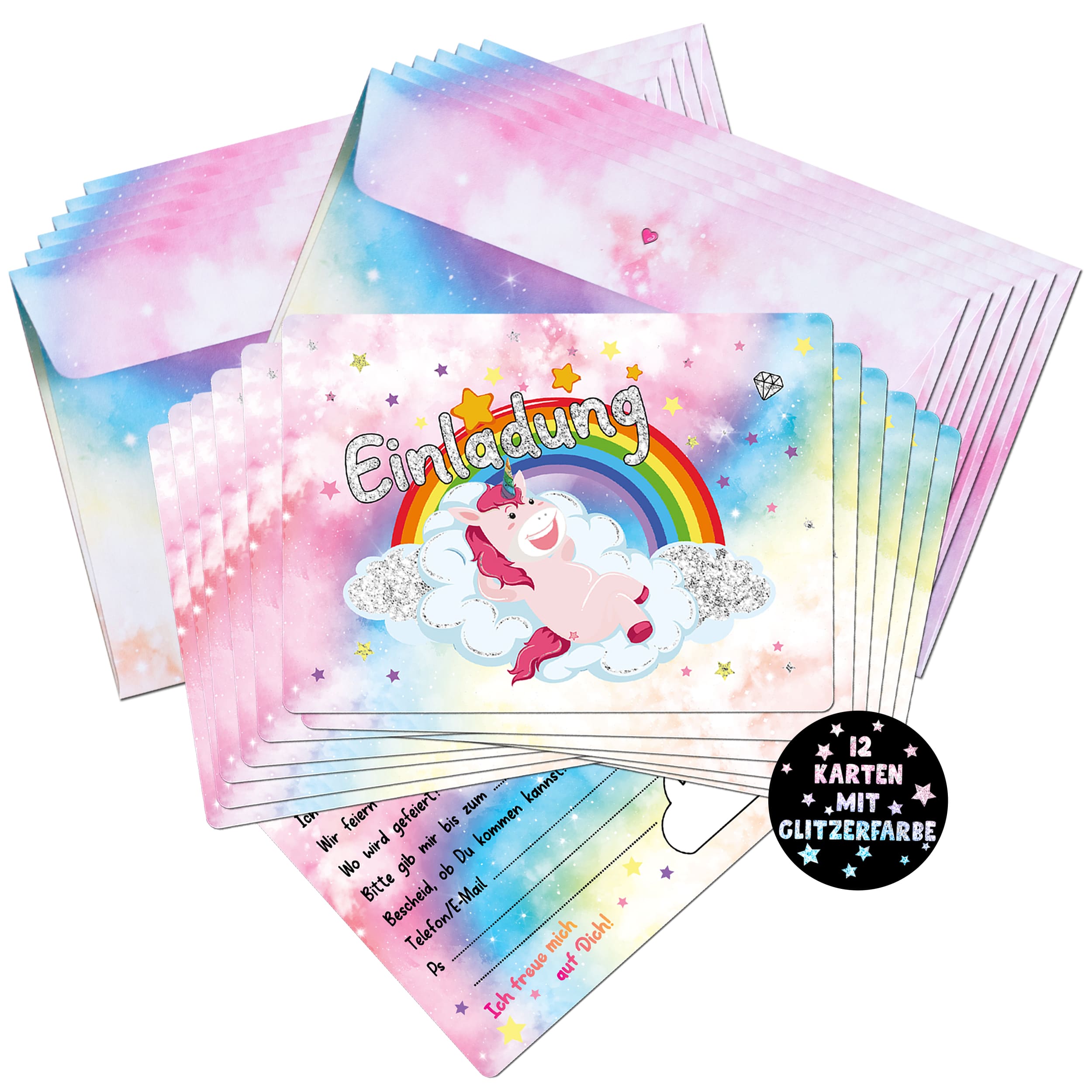 12 Einhorn Glitzer Einladungskarten zum Geburtstag inkl. 12 Umschläge.