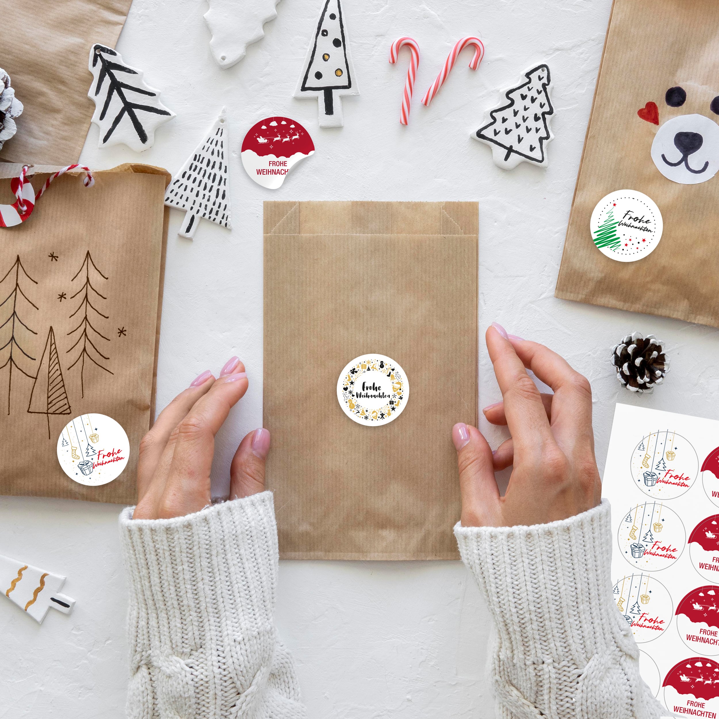 Ein Set Weihnachtsaufkleber beinhaltet 96 Sticker zum Aufkleben auf Geschenke, Grußkarten, Pakete und vieles mehr.