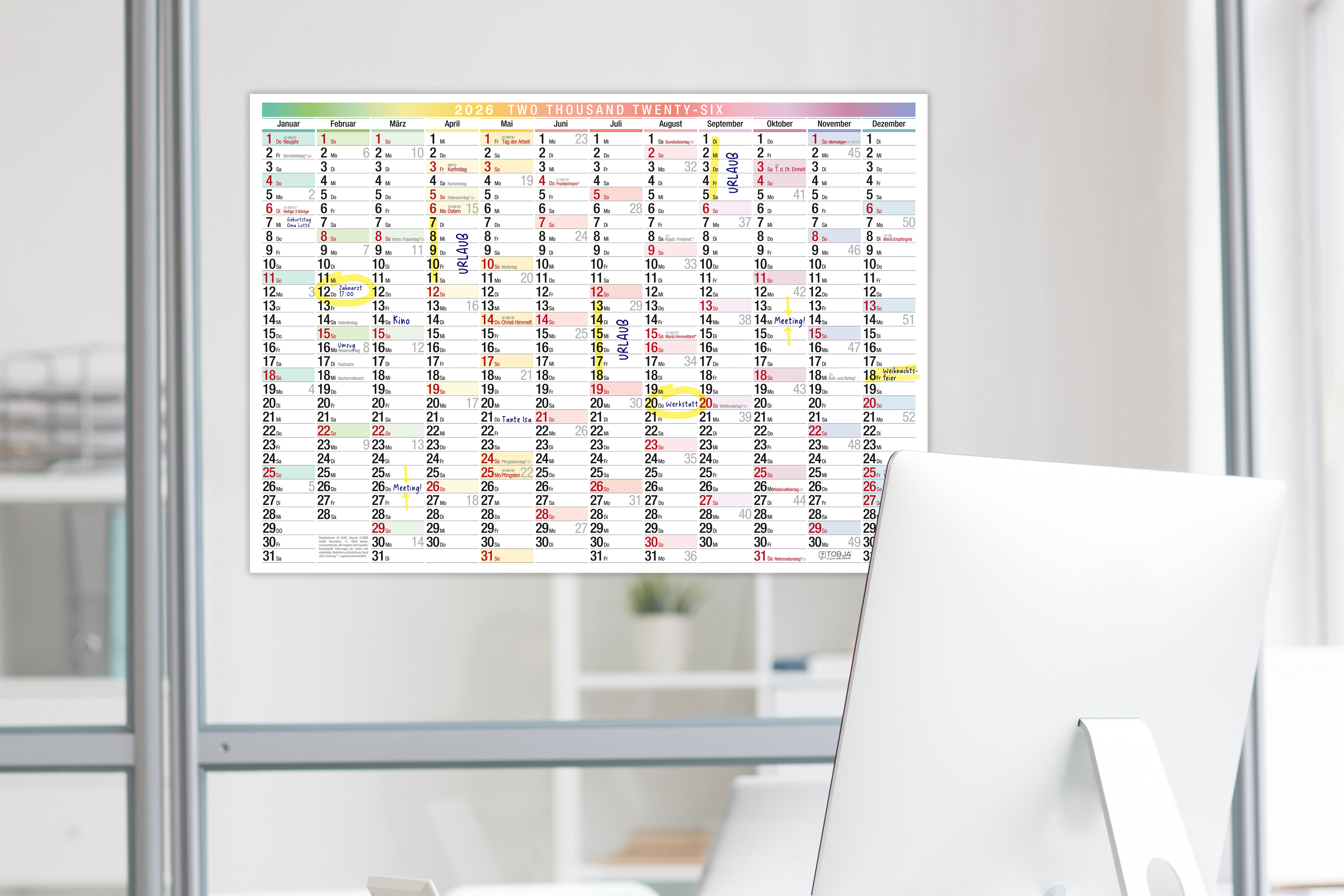 Das robuste Hardcover aus Wibalin und die abgerundeten Ecken verleihen dem Kalender eine langlebige Qualität. Die Lack- und Prägedetails auf dem Cover verleihen ihm eine edle Optik. Mit dem Gummibandverschluss bleibt der Kalender sicher verschlossen, während die zwei Lesebändchen Ihnen helfen, wichtige Seiten schnell zu finden.