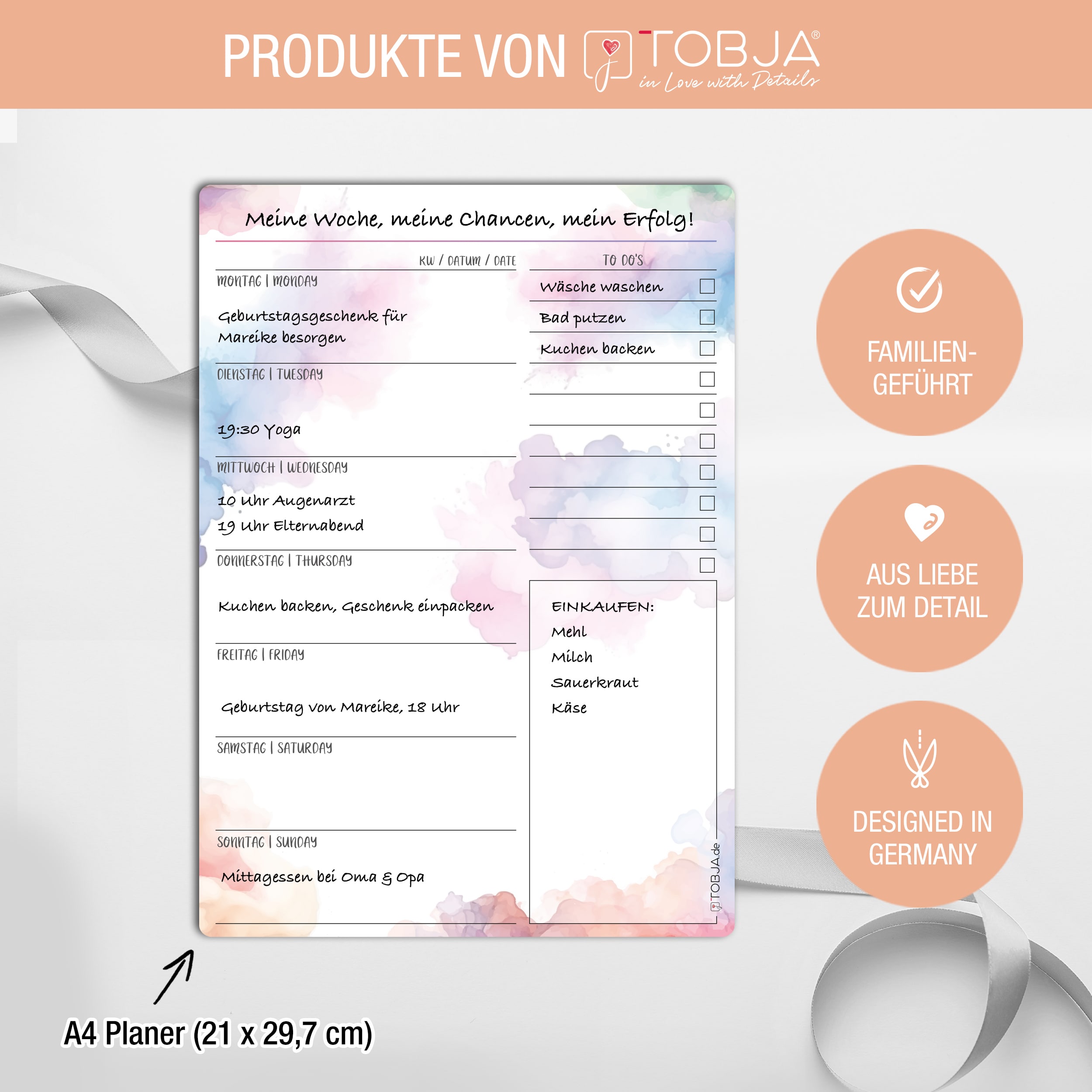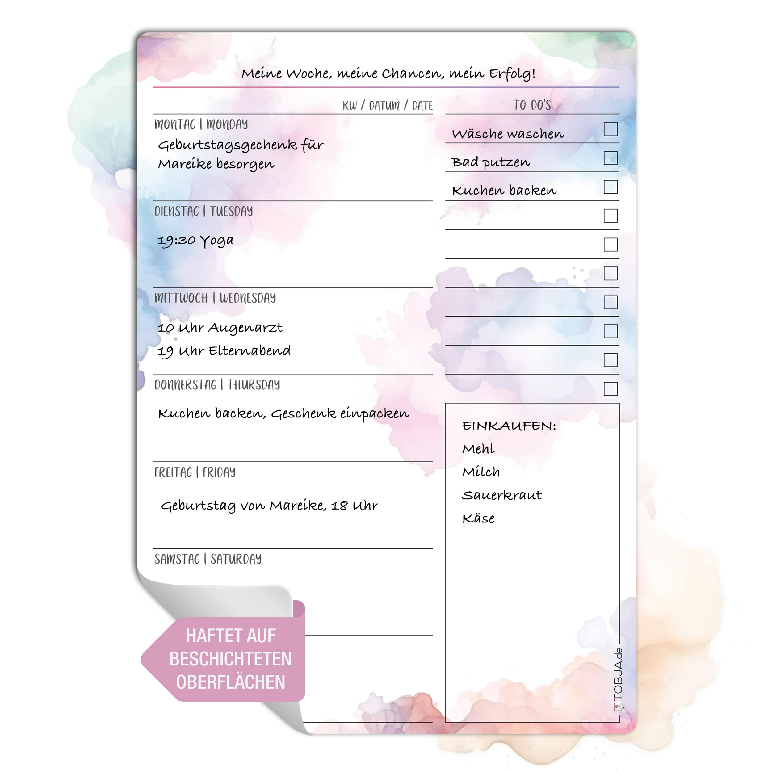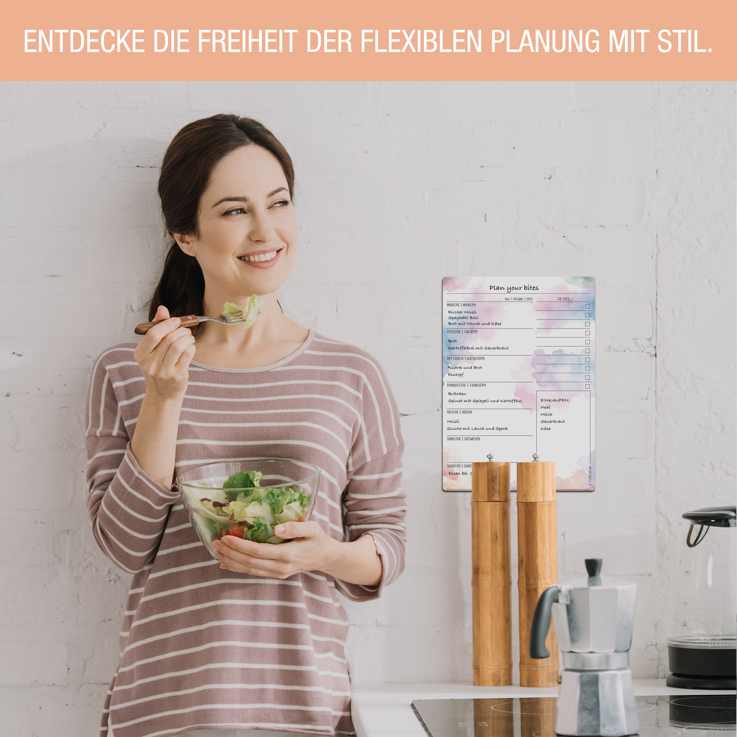 Dann ist unser A4 Menüplaner genau das Richtige für dich! Der wiederablösbare Wochenplaner haftet auf jeder glatten Oberfläche und lässt sich nass abwischen, sollte er nicht mehr so gut haften. Das einzigartige Aquarell-Design in bunten Farben sorgt für gute Laune und macht das Planen zum Vergnügen.