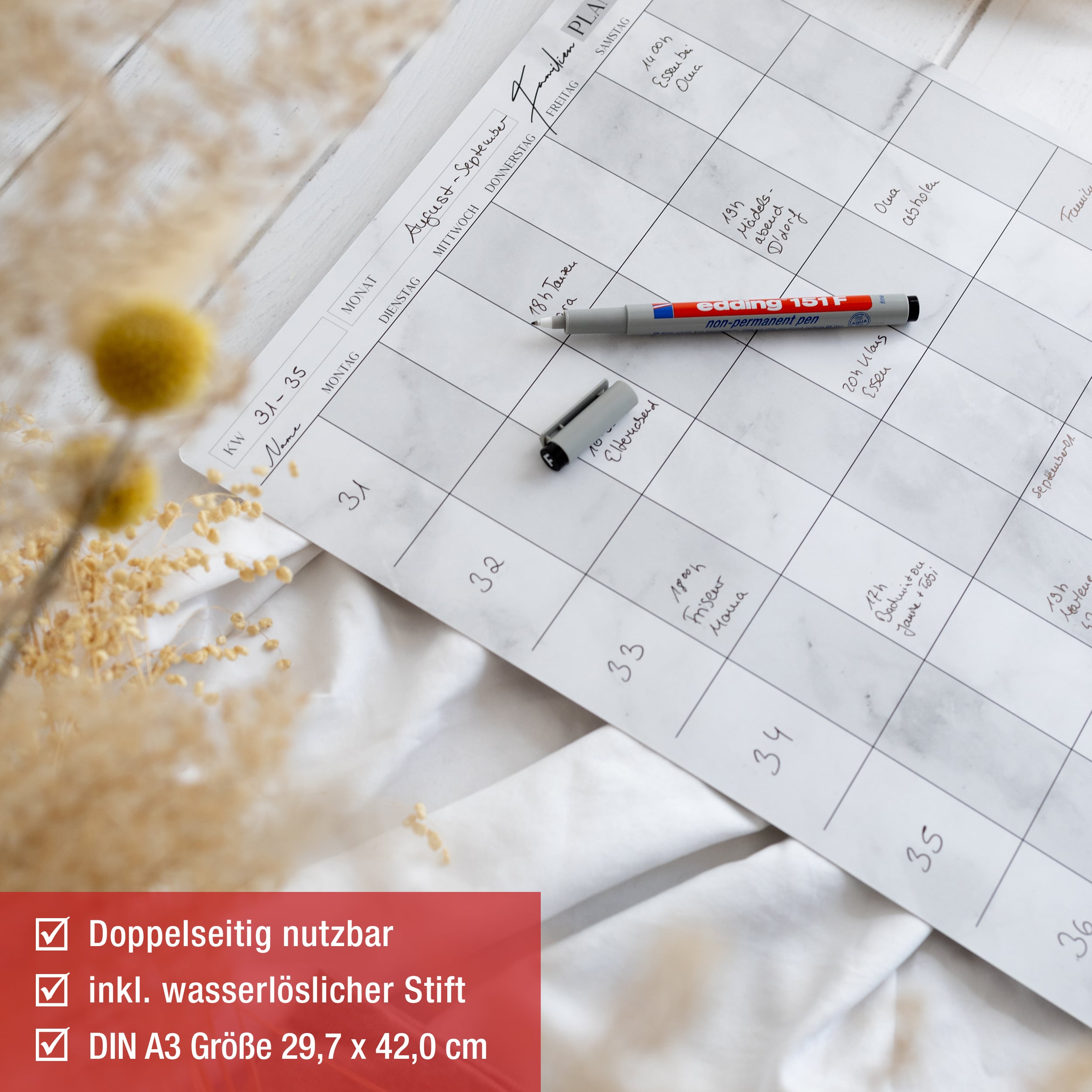 - feucht abwischbar (wasserlöslicher Stift)