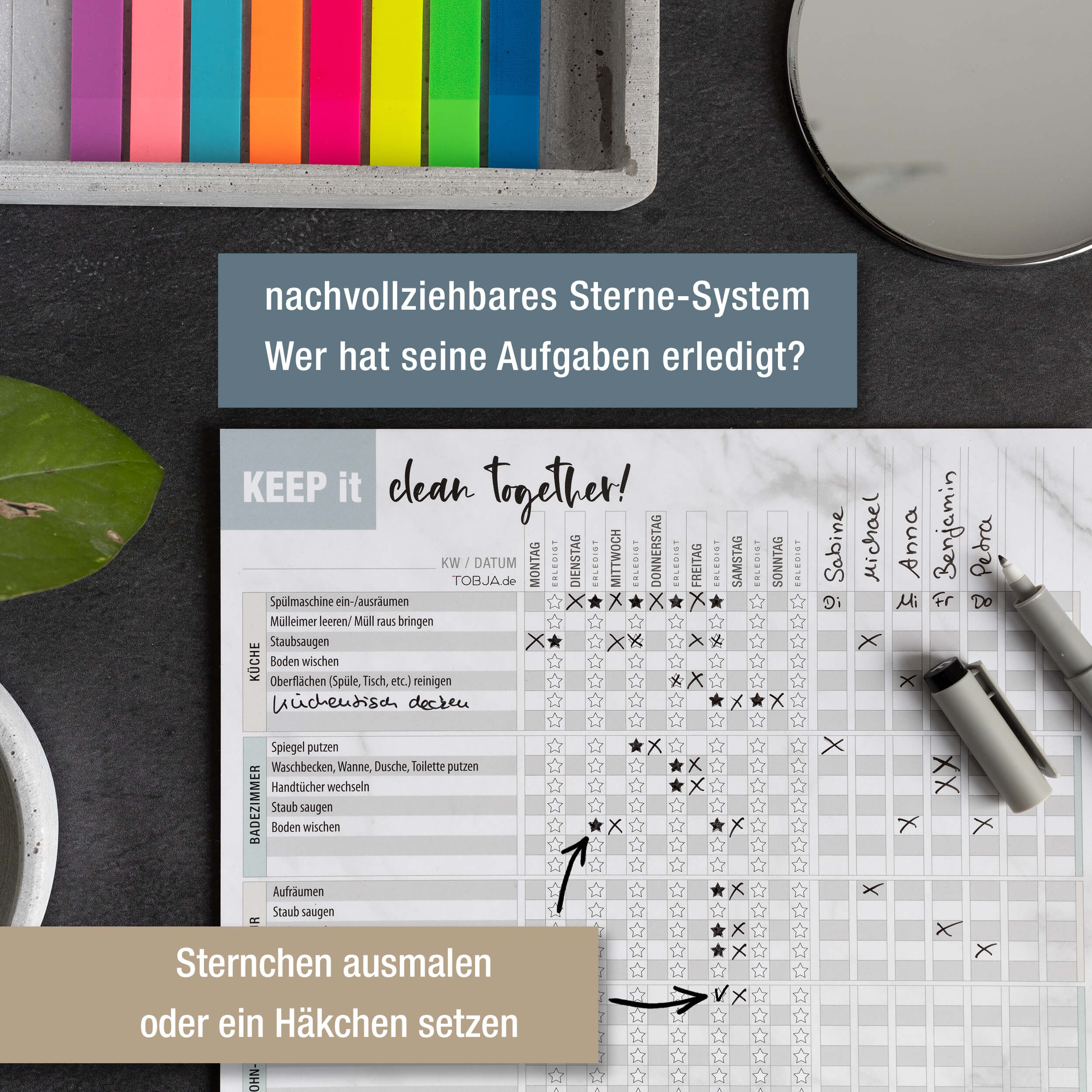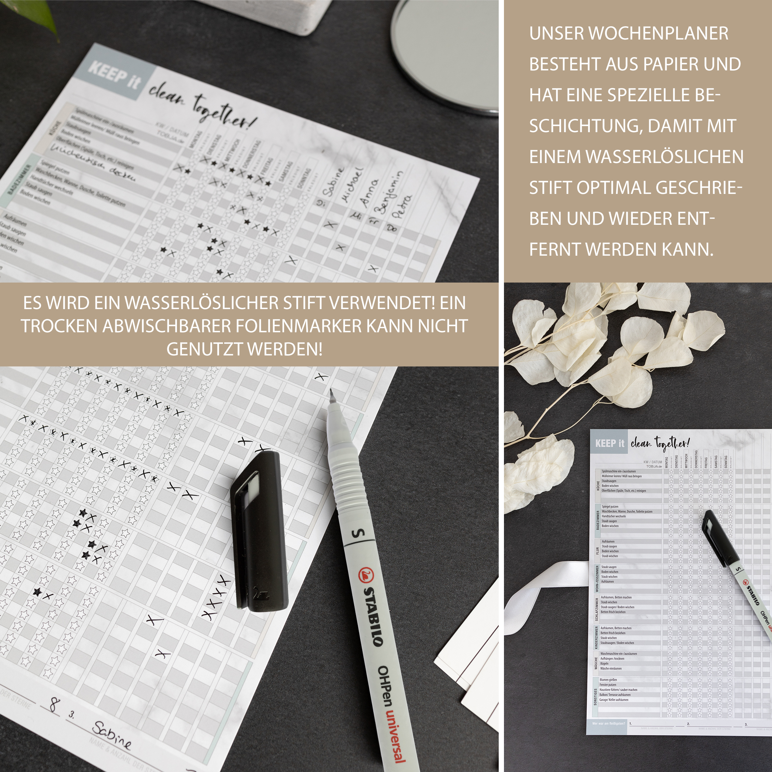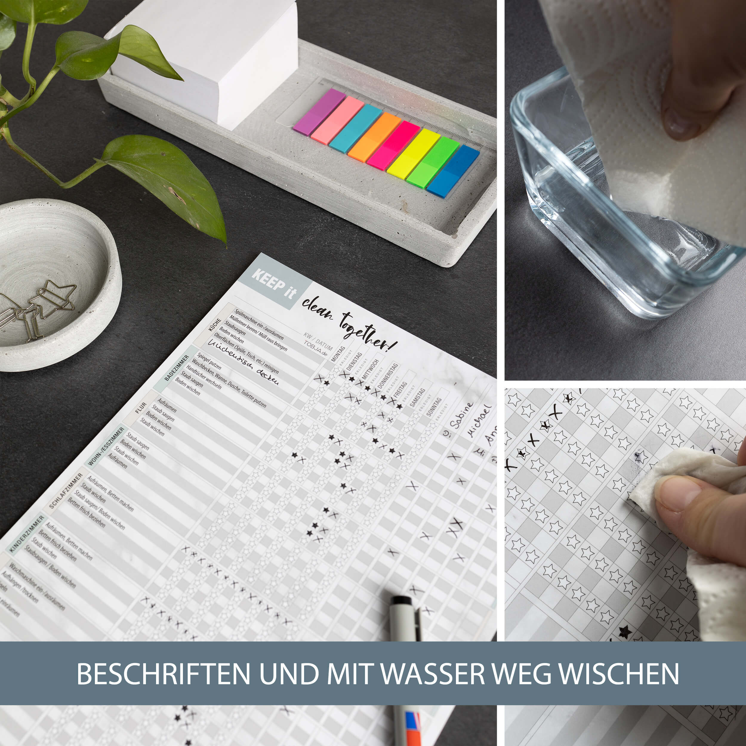 Dank besonderer Beschichtung und mitgelieferttem wasserlöslichen Stift musst Du euren Putzplan nicht jede Woche neu schreiben, stattdessen einfach feucht abwischen und wiederverwenden!