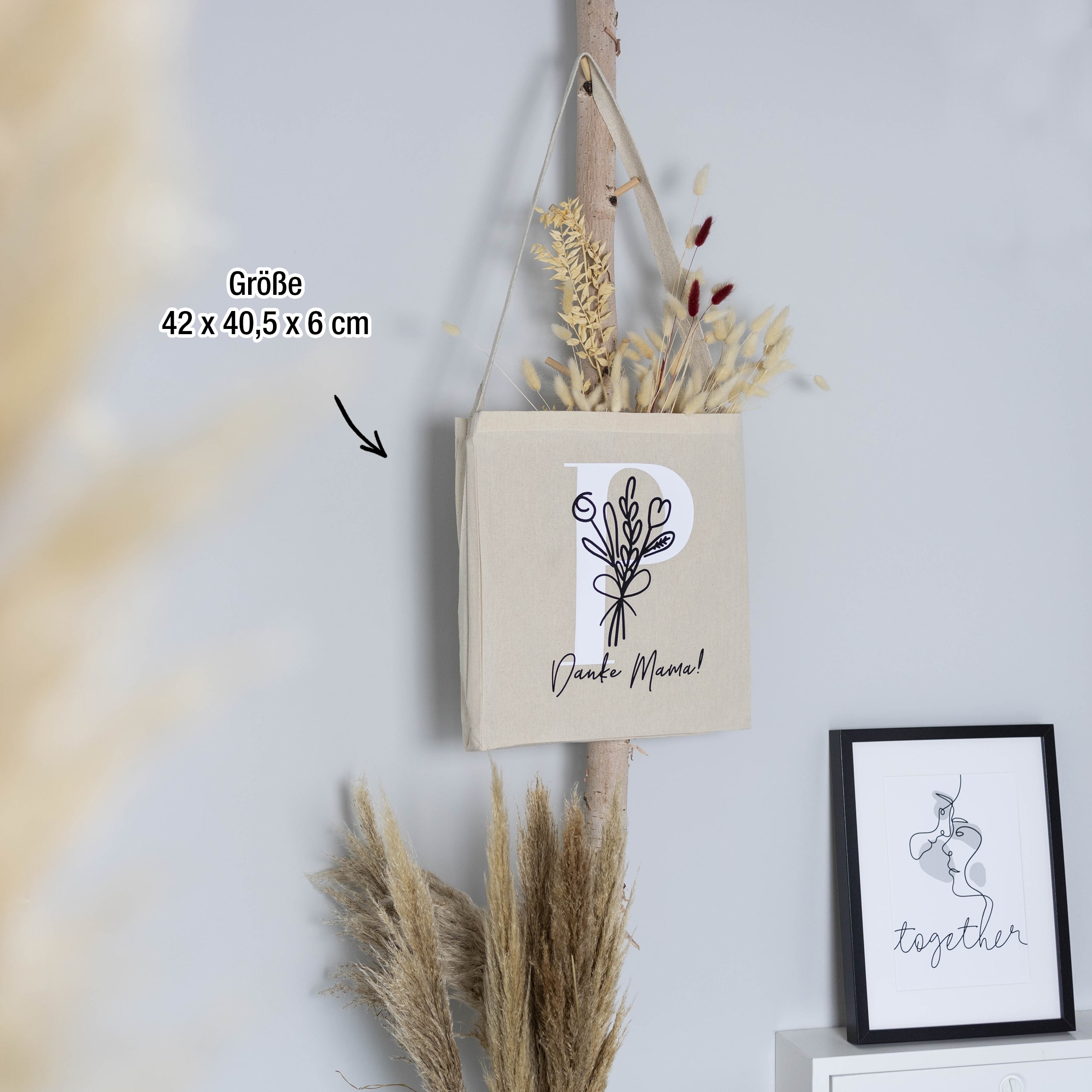 Diese Tasche ist personalisierbar! Du kannst einen großen Buchstaben im Hintergrund wählen und einen Namen (max. 8 Zeichen), der dann ebenfalls auf die Tasche gedruckt wird (nach Danke).