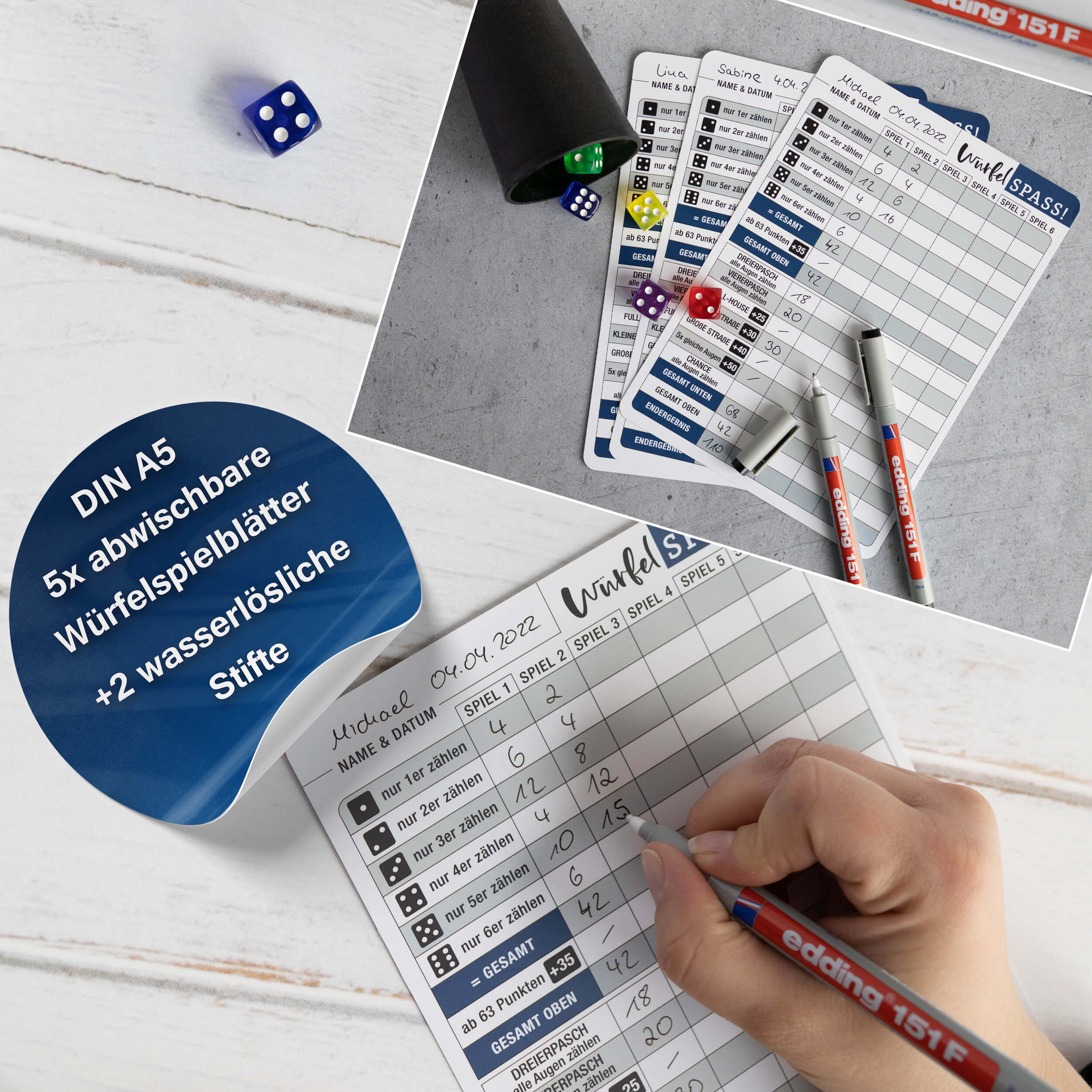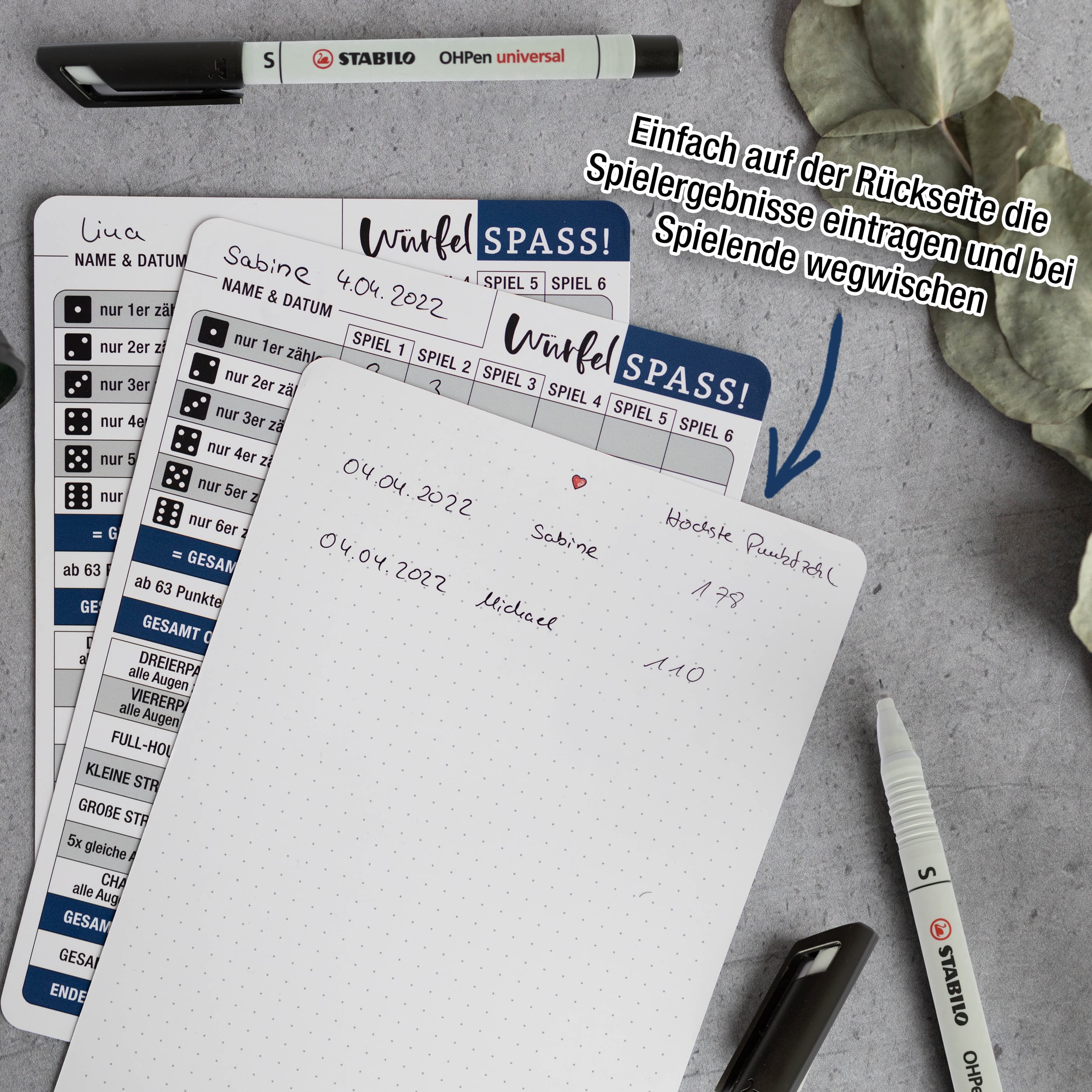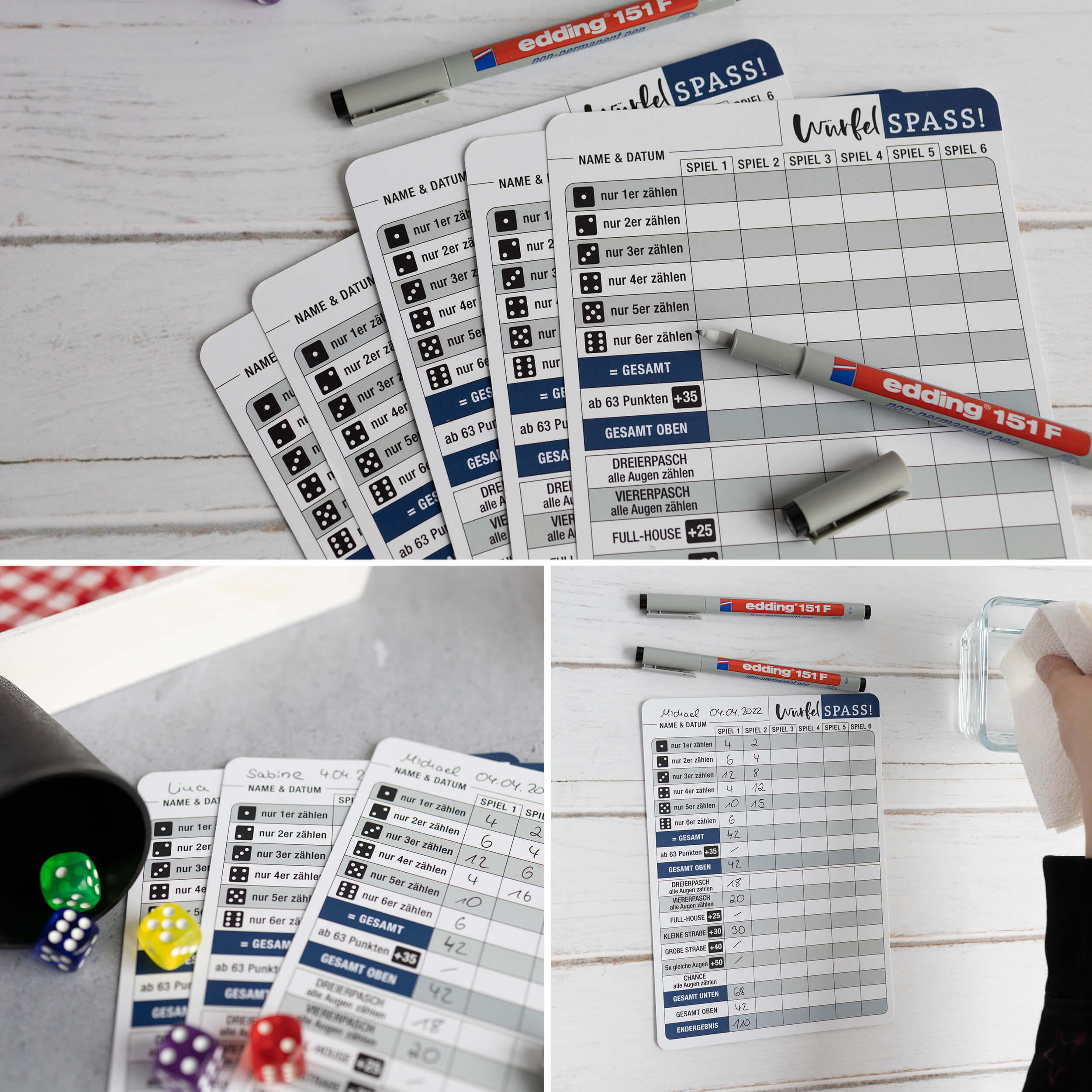 Unser Würfelspiel ist aus echtem Papier, mit einer besonderen Beschichtung angefertigt, somit kannst Du es dank unseren zwei mitgelieferten wasserlöslichen Filzstiften immer wieder verwenden.