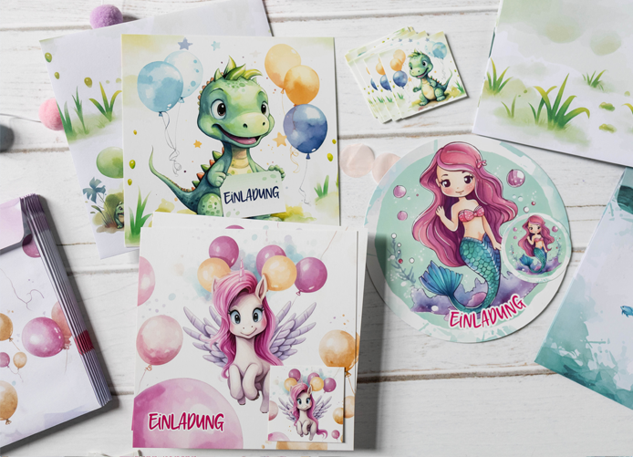 Einladungen, die Träume wecken Beginnt mit Einladungskarten, die kleine Geschichten erzählen. Unsere Designs – von zauberhaften Meerjungfrauen über mutige Dinosaurier bis hin zu magischen Einhörnern und fleißigen Baustellenhelfern – laden die Kinder ein, in eine Welt voller Fantasie einzutauchen. Diese Karten sind nicht nur der erste Schritt ins Abenteuer, sondern auch eine wunderschöne Erinnerung für eure kleinen Gäste und ihre Eltern.