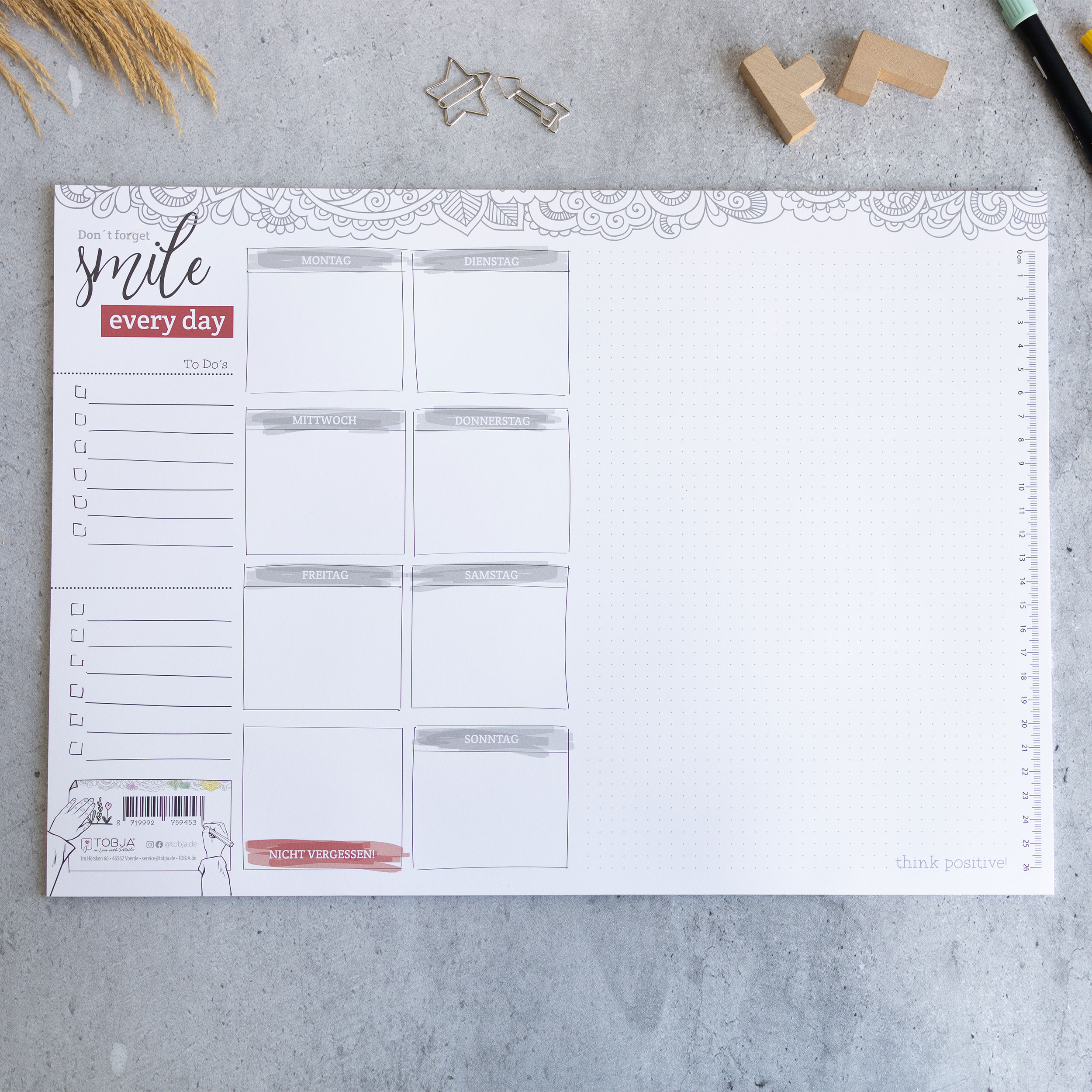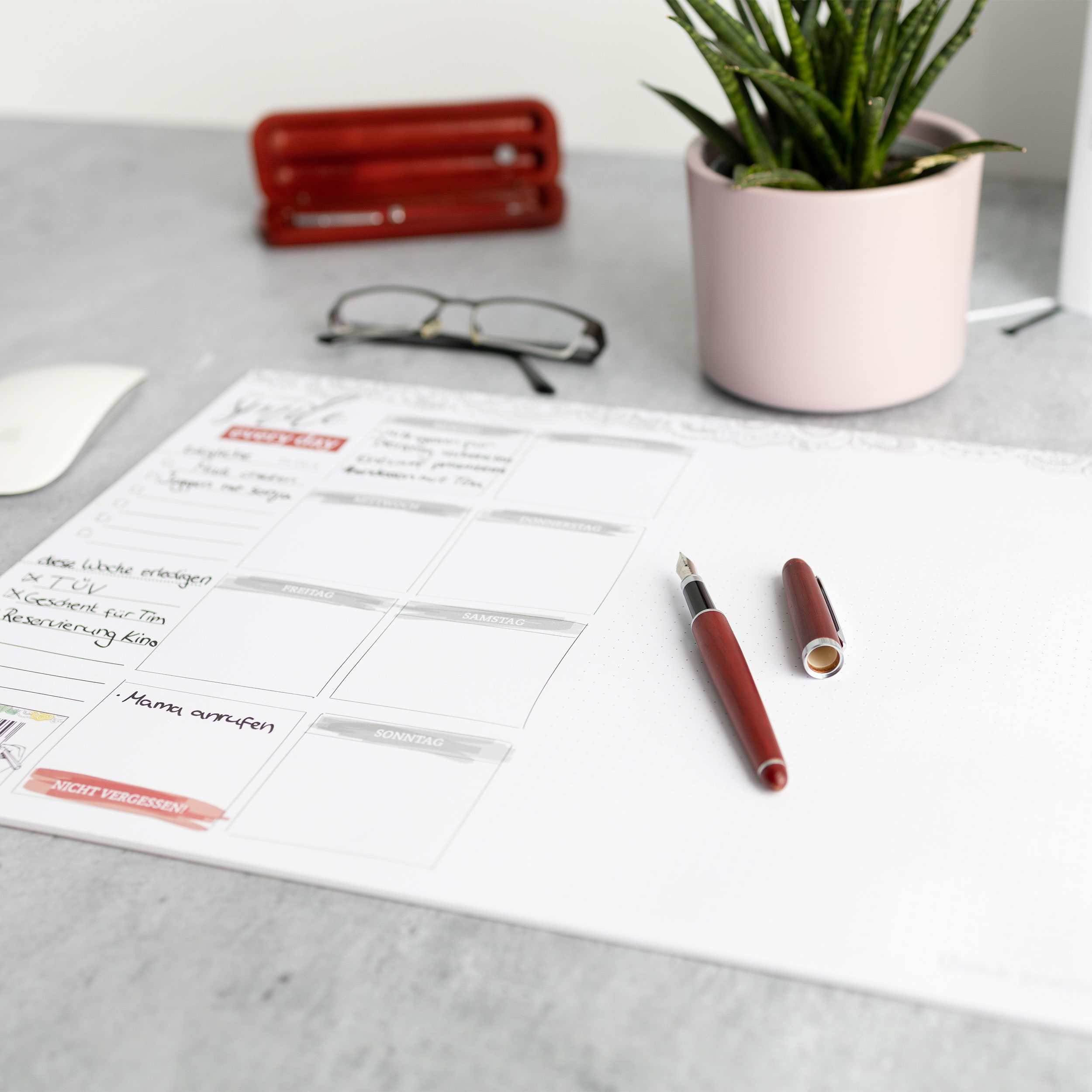 Mit unserer Schreibtischunterlage im A3 Format hast du alles immer im Blick! Mit ihren 25 Blatt reicht dir die Unterlage als Wochenplaner sogar für ein halbes Jahr. Hake auf der To-do Liste alles ab, was du erledigt hast und plane ganz nebenbei auch noch deinen Tag, so hältst du ganz bestimmt Ordnung an deinem Arbeitsplatz.