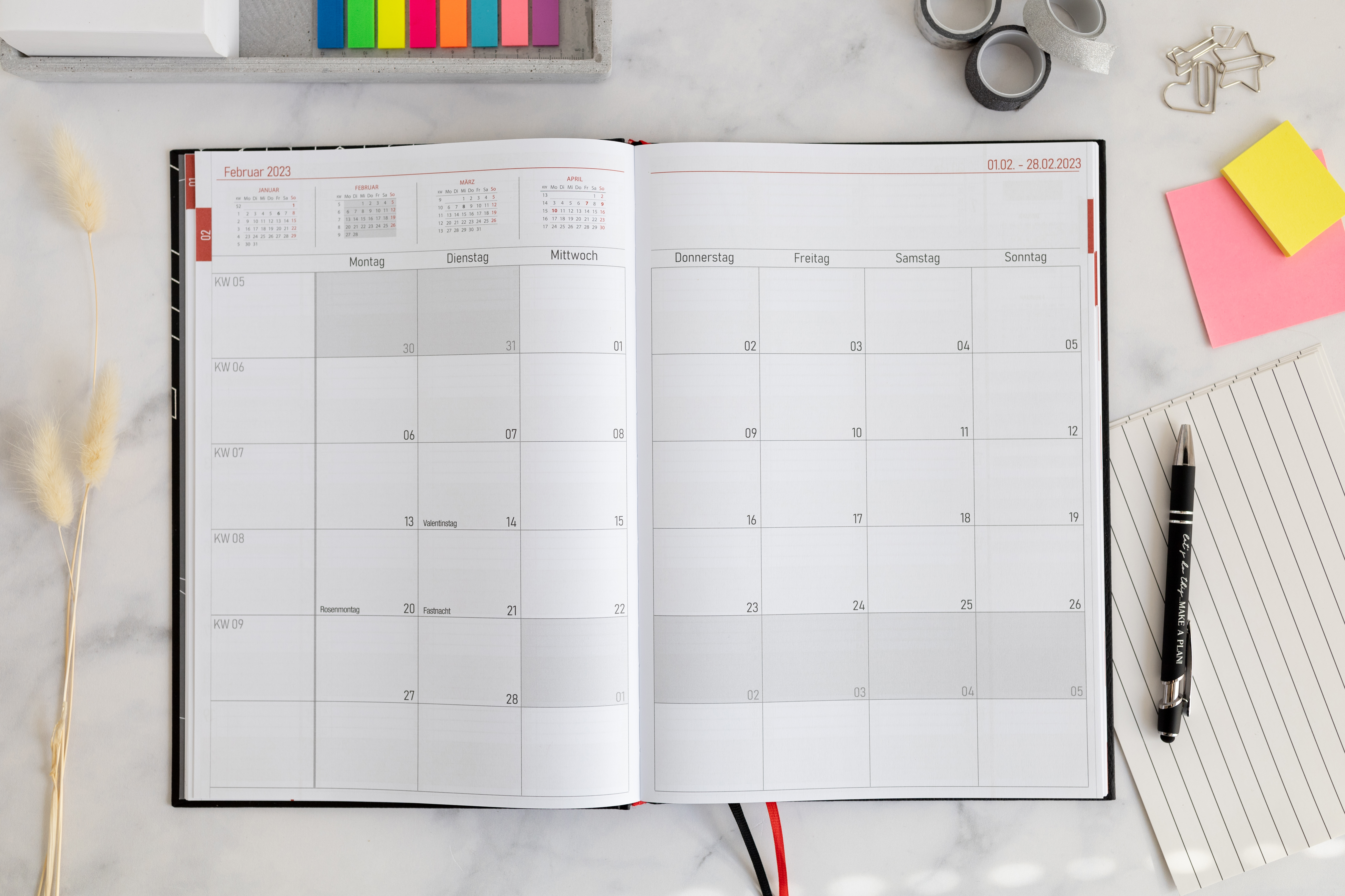 in jede Handtasche. So bist du völlig unabhängig und hast alle wichtigen Infos jederzeit greifbar in der Hand. Für alle die sich nicht nur auf moderne Technik verlassen wollen sind unsere Kalender im praktischen Kleinformat genau die richtige Wahl. Egal ob in A5 mit Stifthalter,  oder im handlichen Taschenformat in rot, schwarz oder Denim. Bei uns ist für jeden Geschmack etwas dabei.