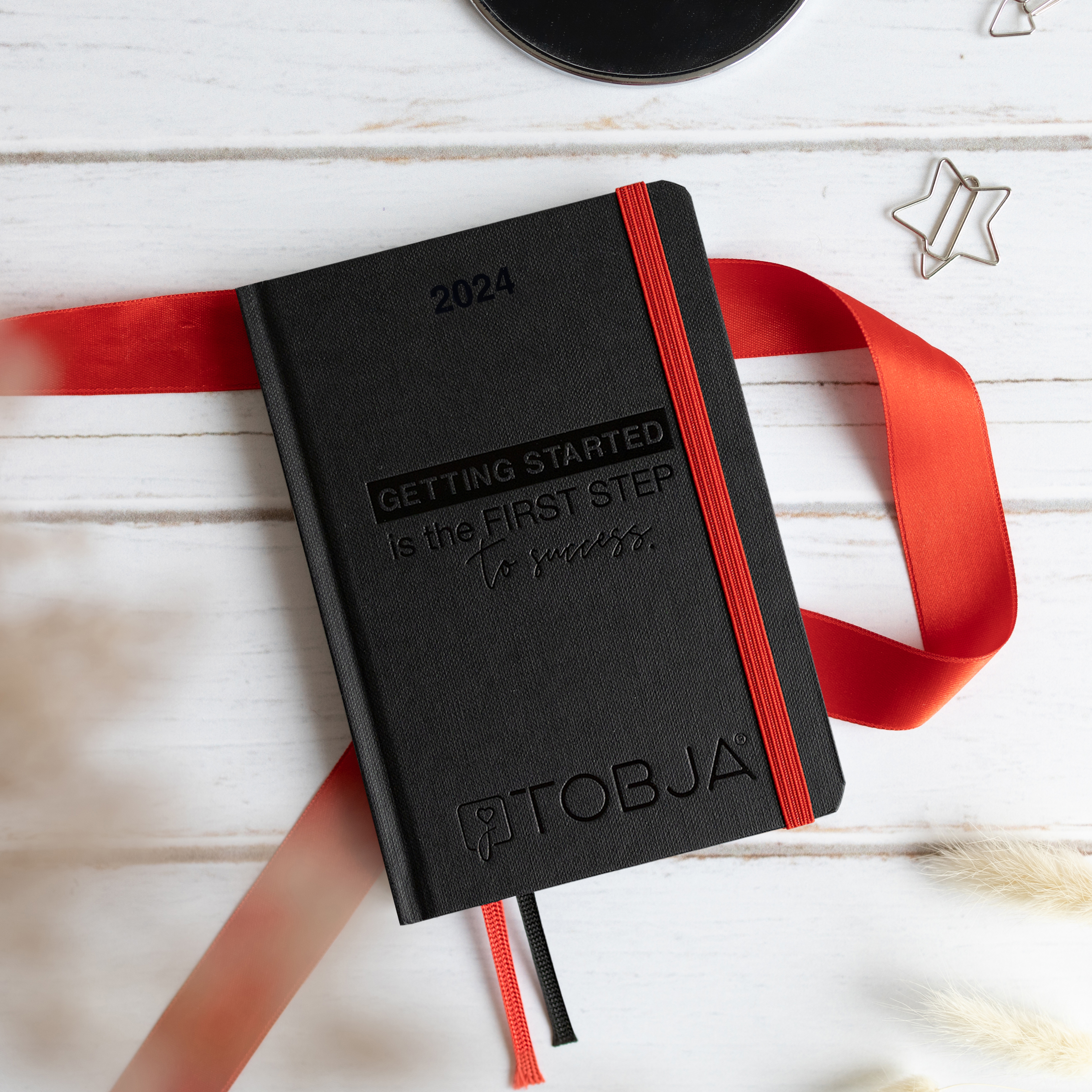 Wer es gerne etwas farbig mag, liegt bei unserem A6 Kalender "Red Success" genau richtig. Auch hier findest du eine Doppelseite pro Woche und zudem lässt er sich mit dem praktischen Gummiband ganz einfach verschließen.