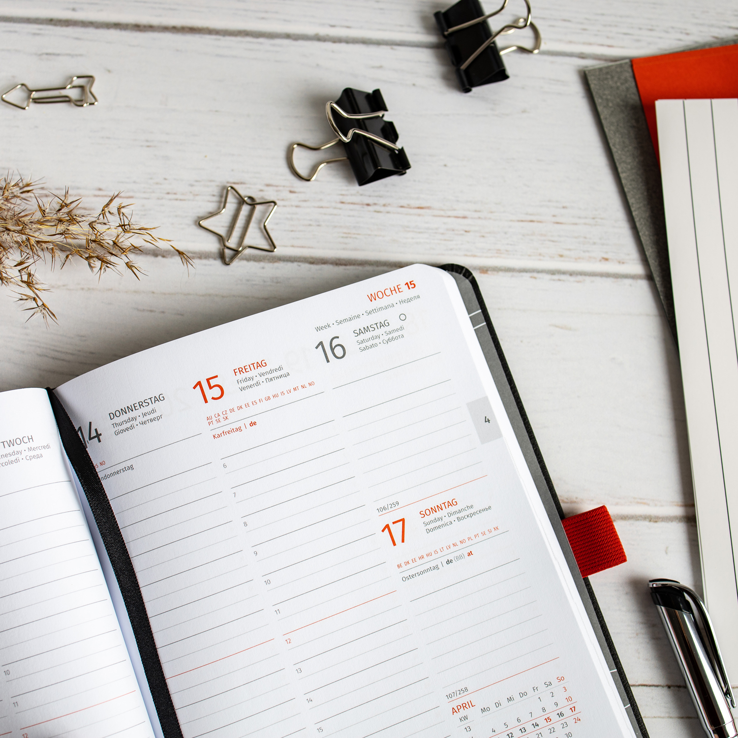 Unser Taschenkalender "Black Success" in schwarz scheint zwar klein, hat allerdings, wenn man ihn aufklappt, ganz schön viel zu bieten. Hier findet wirklich alles Platz was wichtig ist und zudem hast du deine Termine immer in der Handtasche mit dabei.