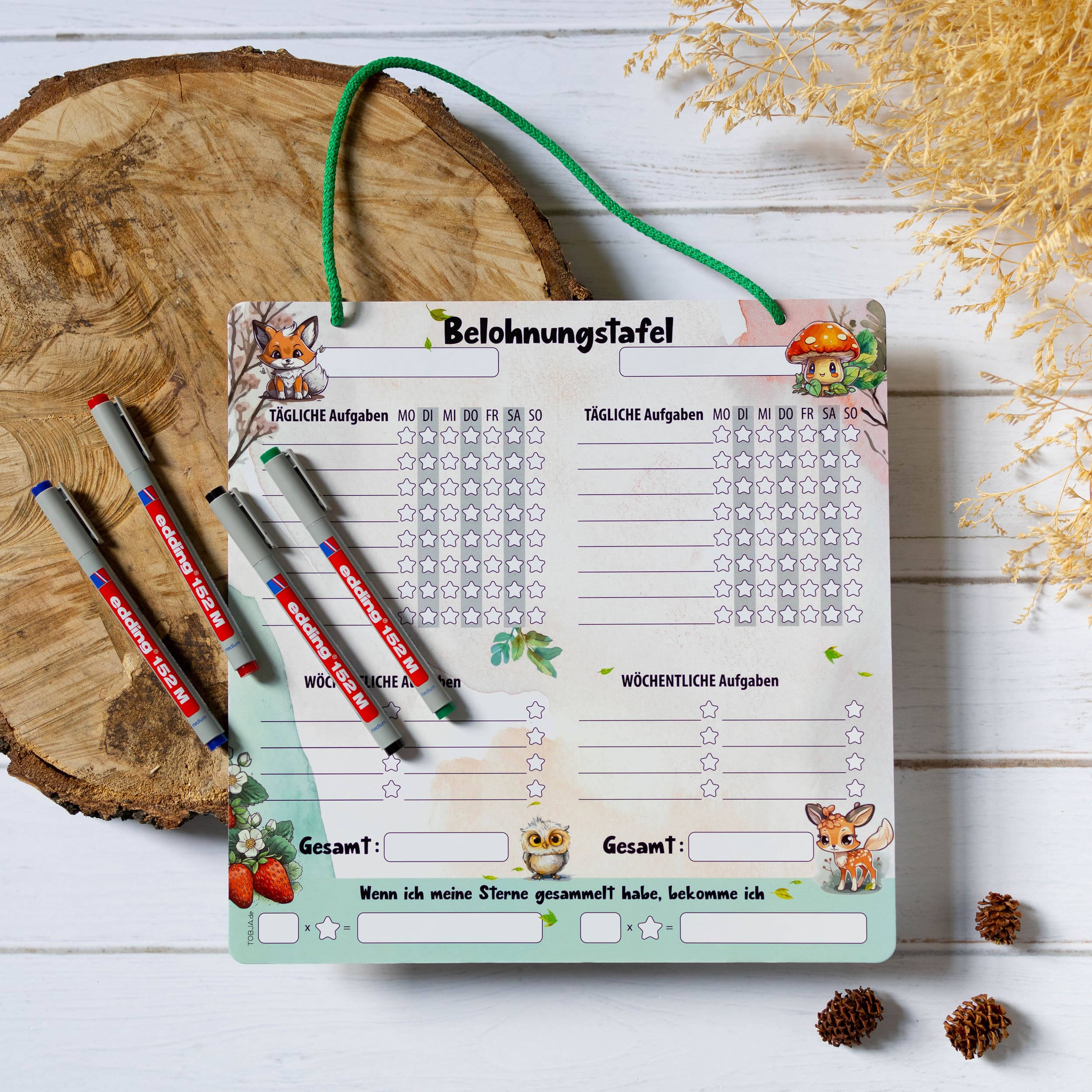 Diese vielseitige Tafel ist ideal für zwei Kinder und hilft dabei, tägliche und wöchentliche Aufgaben übersichtlich zu planen. Das motivierende Sternesystem fördert positive Gewohnheiten und gibt den Kleinen eine spielerische Möglichkeit, ihre Fortschritte zu verfolgen.